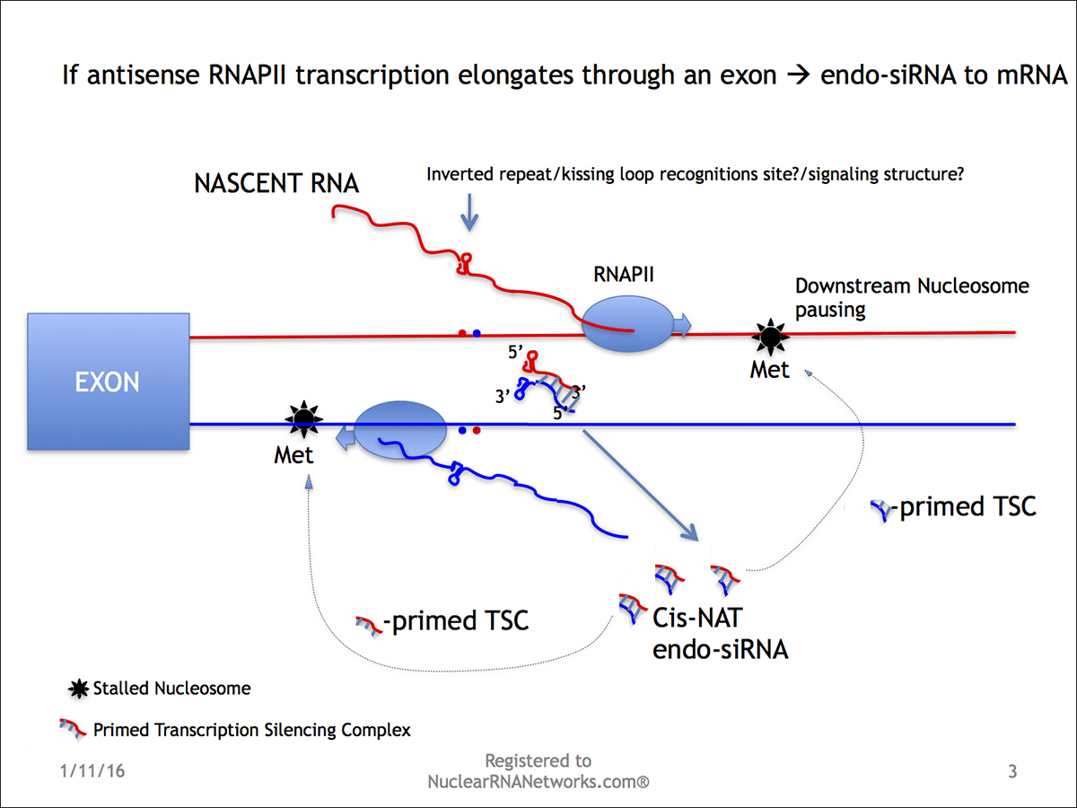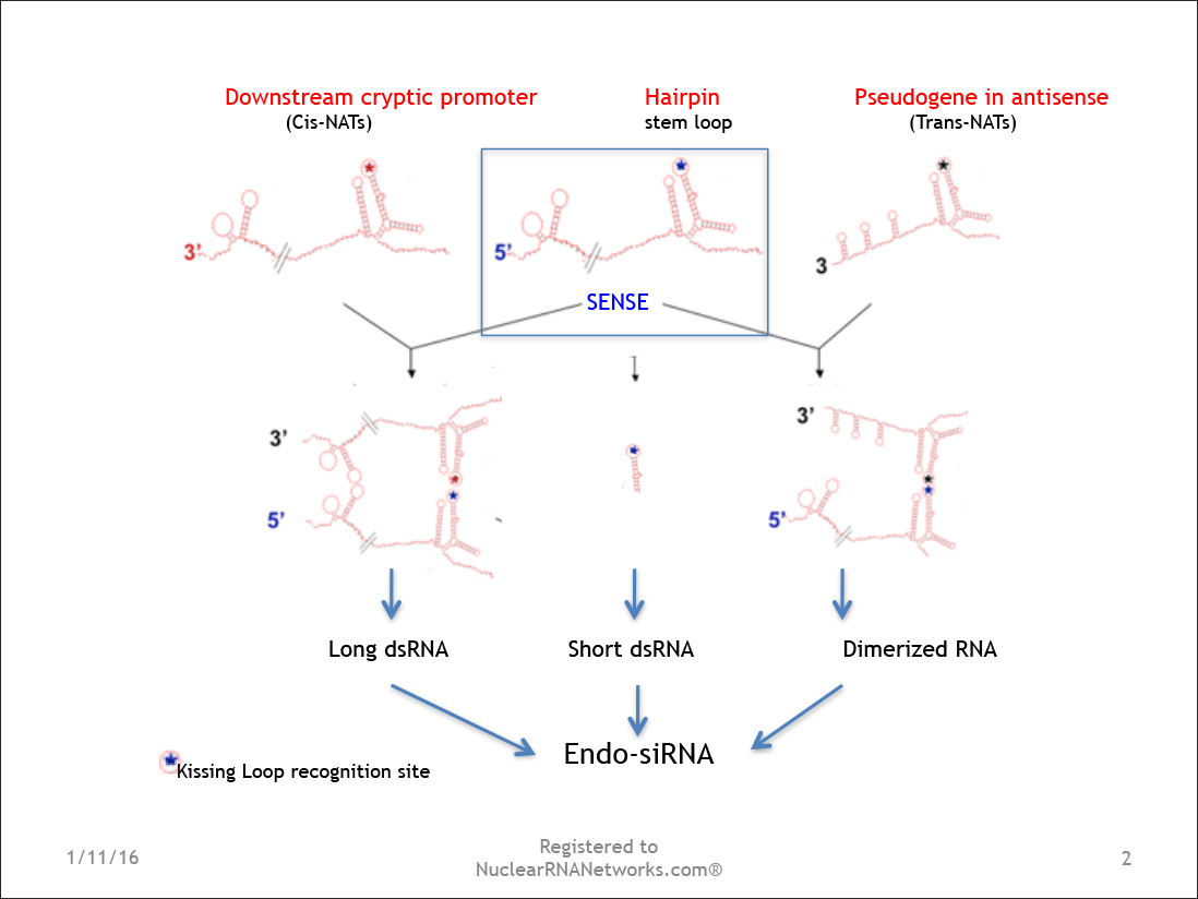 Overlapping sense/antisense RNAs are common in vertebrates 1. Endo-siRNA formation secondary to transcription from the same genomic locus or from pseudogenes participates in oocyte development 2. Hairpin formations, such as those formed by highly conserved sequences in Transposable Elements (TE), (eg, the stem loop structures within Alu Repeats), might seed kissing stem loops or otherwise signal the recruitment of a transcription silencing complex.